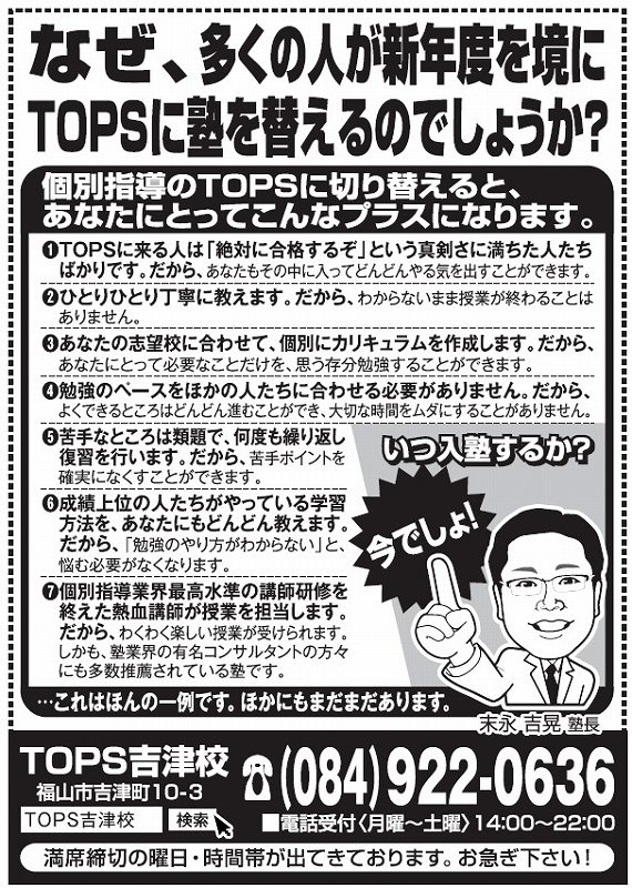 日本最大級の完全個別学習塾 TOPS吉津校 〒720-0072 広島県福山市吉津町10-3TEL 084-922-0636