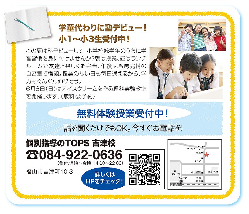 日本最大級の完全個別学習塾 TOPS吉津校 〒720-0072 広島県福山市吉津町10-3TEL 084-922-0636