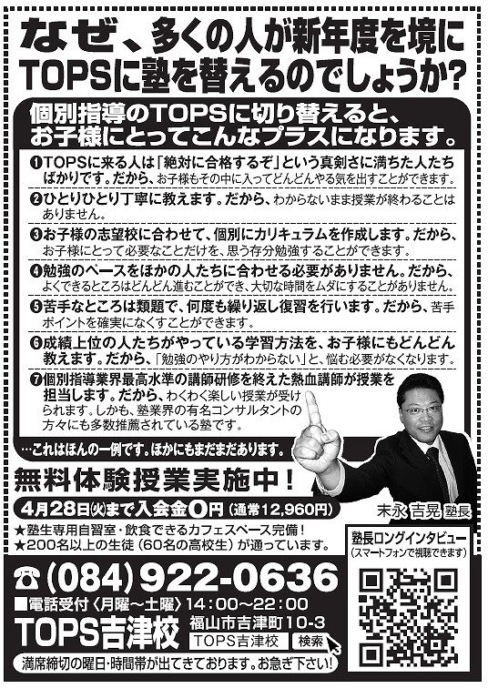 日本最大級の完全個別学習塾 TOPS吉津校 〒720-0072 広島県福山市吉津町10-3TEL 084-922-0636