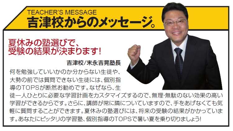 日本最大級の完全個別学習塾 TOPS吉津校 〒720-0072 広島県福山市吉津町10-3TEL 084-922-0636